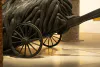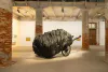 Who determines what is a wasteland? That’s the premise of a massive, black-painted wooden sculpture, titled Wastelands (2024), by Brett Graham (Ngāti Koroki Kahukura, Tainui). The work takes the shape of a pātaka (storehouse) that he has put on wheels. Traditionally, the appearance of a pātaka holds special significance: how ornate the carvings on one’s pātaka was a sign of wealth and prestige in the community. But Graham has subverted this by carving into his pātaka the image of eels, a traditional food source of the Tainui people. During colonization of New Zealand, the Western-imposed government passed a law that deemed swamplands, a habitat of eels and important resource for the Māori generally, as “waste,” essentially deeming them “unoccupiable land, redefining them as territories of wetland to be drained and turned towards agriculture,” per the wall text. Graham then has gathered these eels to save them, honoring their importance to the well-being of Māori people.