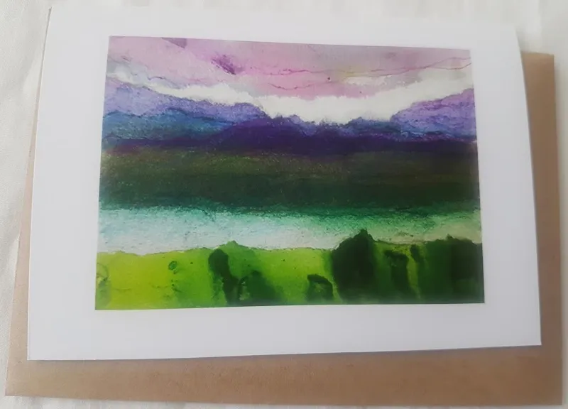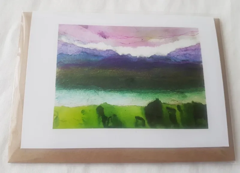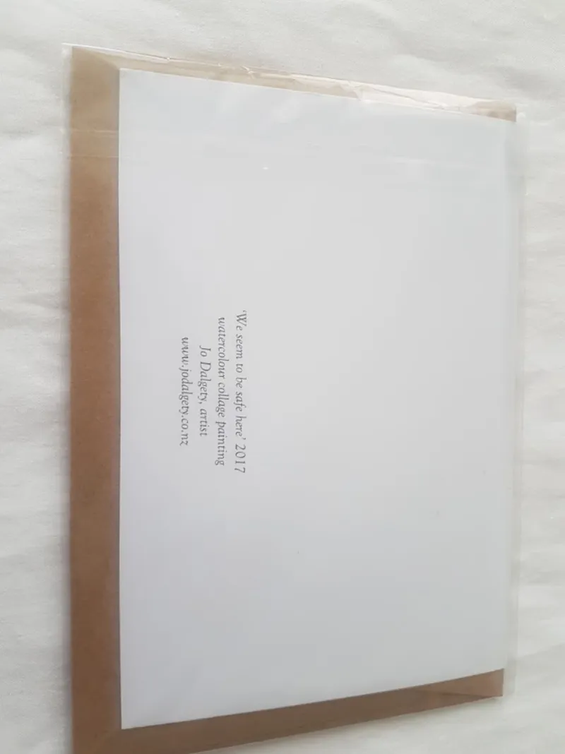 A blank greeting card printed with one of my paintings 'We seem to be safe here'. The original painting is a landscape collaged from old watercolour and aquarelle pencil paintings. A painting of the Canterbury region of the South Island in New Zealand.