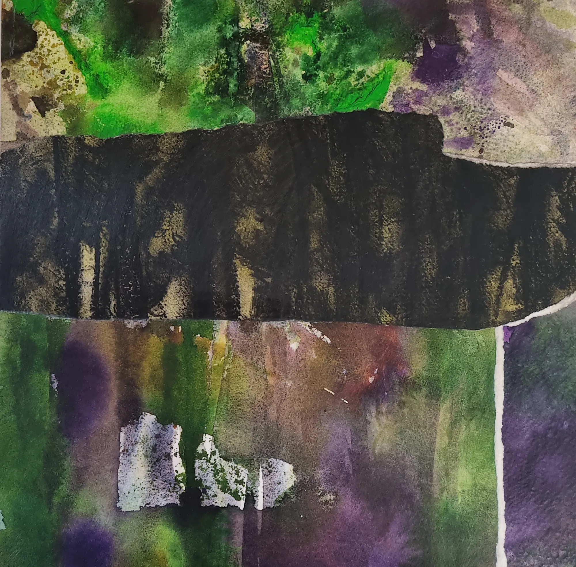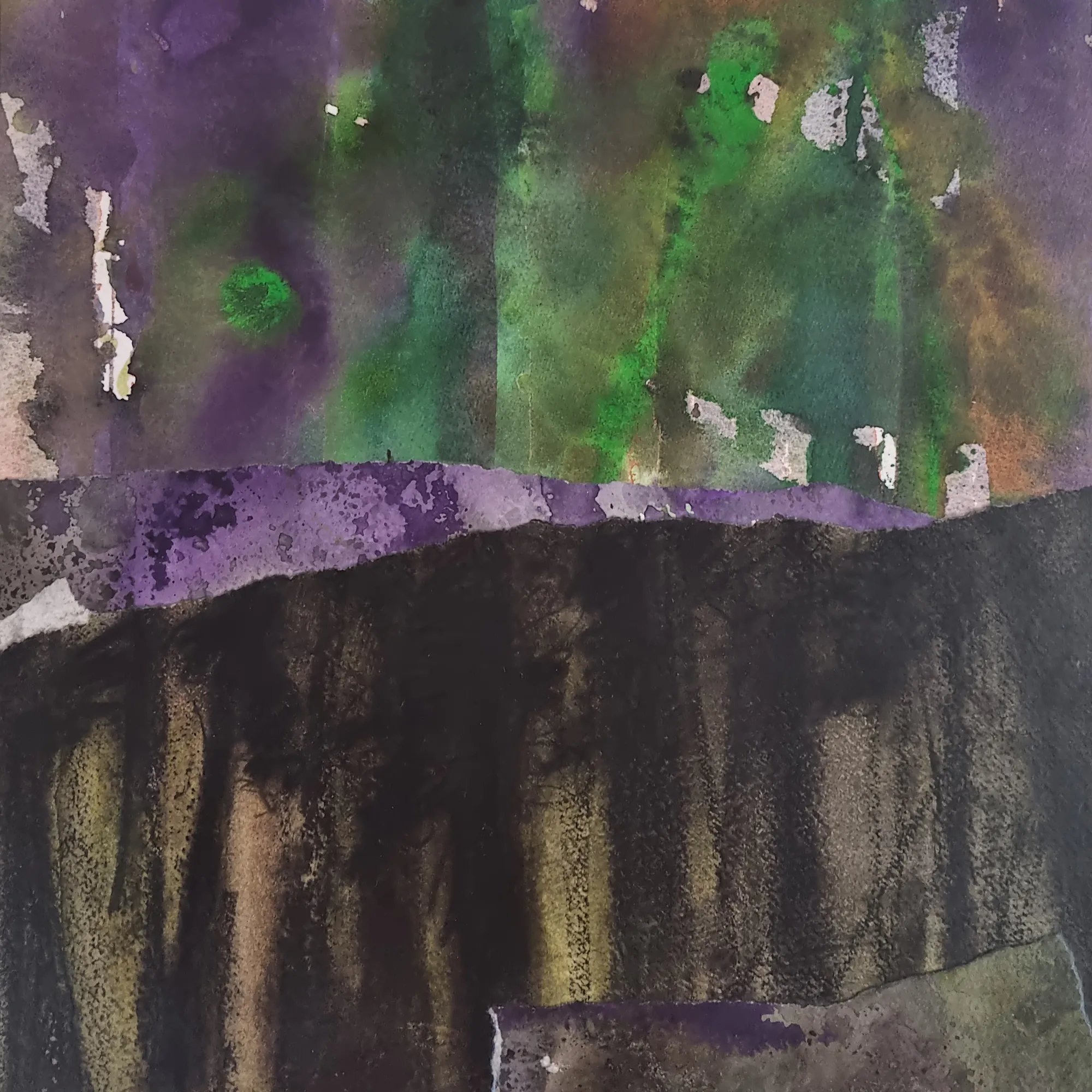Jo Dalgety working with water colour, charcoal, mono printing and collage has begun an exploratory creative journey looking back into a land that once was. Her childhood home seen in challenging a new light.